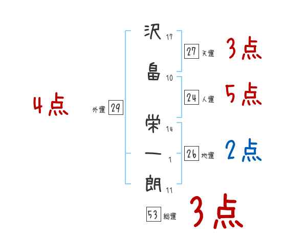 総運![]() | 沢畠栄一朗さんの総運は53画の3つ星!やや見栄っ張りで虚栄心がある。散財に注意。 あなたの人生を表す1番重要な運勢です。生涯を通じて影響する総合運となり、主に50歳以降の晩年期に影響を及ぼします。 |