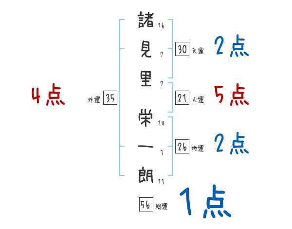 外運![]() | 諸見里栄一朗さんの外運は35画の4つ星!温厚な性格で感受性が高い。穏和な性格で人望が厚い。 生活面を象徴する運勢です。外部から受ける影響力を表し、結婚運、家庭運や職場、環境への順応性を表します。 |