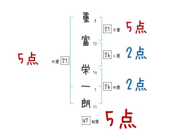 天運![]() | 重富栄一朗さんの天運は21画の5つ星!統率力がある。独立し成功する。名誉を手に入れる。 家系が持つ宿命的な運勢を表します。祖先から受け継いだ苗字ですので自分の力が及びません。家柄を象徴します。 |