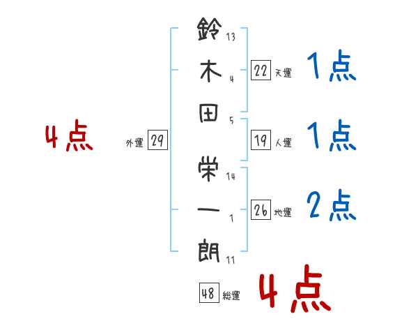 外運![]() | 鈴木田栄一朗さんの外運は29画の4つ星!完全主義で才能がある。厳格な心の持ち主。 生活面を象徴する運勢です。外部から受ける影響力を表し、結婚運、家庭運や職場、環境への順応性を表します。 |
