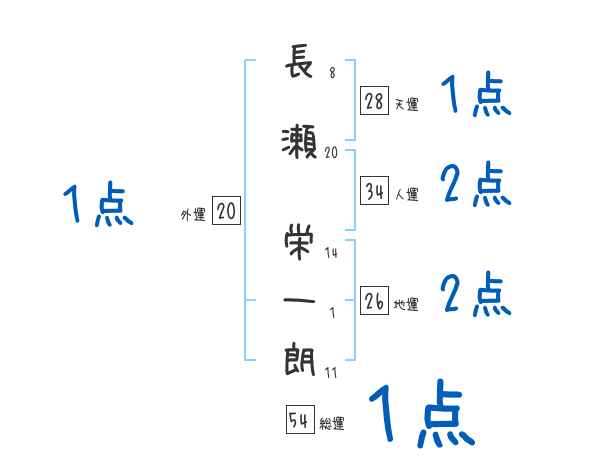 天運![]() | 長瀬栄一朗さんの天運は28画の1つ星!家庭環境に注意。スポーツで活躍できる能力があるかも。 家系が持つ宿命的な運勢を表します。祖先から受け継いだ苗字ですので自分の力が及びません。家柄を象徴します。 |