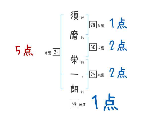 天運![]() | 須磨栄一朗さんの天運は28画の1つ星!家庭環境に注意。スポーツで活躍できる能力があるかも。 家系が持つ宿命的な運勢を表します。祖先から受け継いだ苗字ですので自分の力が及びません。家柄を象徴します。 |