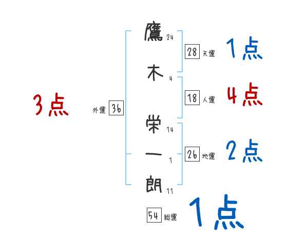 外運![]() | 鷹木栄一朗さんの外運は36画の3つ星!先見性が豊かです。多少神経質で苦労することも。 生活面を象徴する運勢です。外部から受ける影響力を表し、結婚運、家庭運や職場、環境への順応性を表します。 |