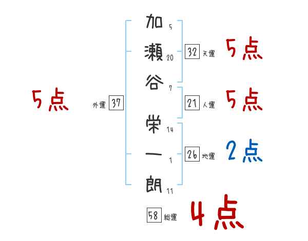 天運![]() | 加瀬谷栄一朗さんの天運は32画の5つ星!柔軟性があり成功する。チャンスが多く金運が良い。 家系が持つ宿命的な運勢を表します。祖先から受け継いだ苗字ですので自分の力が及びません。家柄を象徴します。 |