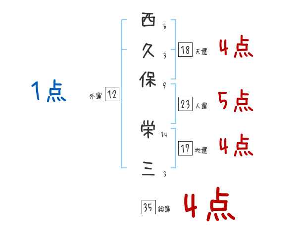 天運![]() | 西久保栄三さんの天運は18画の4つ星!情熱的で剛気。忍耐力があり信頼される。 家系が持つ宿命的な運勢を表します。祖先から受け継いだ苗字ですので自分の力が及びません。家柄を象徴します。 |