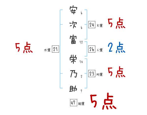 総運![]() | 安次富栄乃助さんの総運は47画の5つ星!実力が開花し発展する円満な人生。財に恵まれる。 あなたの人生を表す1番重要な運勢です。生涯を通じて影響する総合運となり、主に50歳以降の晩年期に影響を及ぼします。 |
