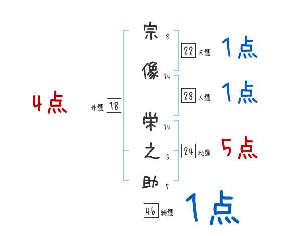 天運![]() | 宗像栄之助さんの天運は22画の1つ星!努力することが苦手ないっぽう手先が器用。芸術性にも優れる。 家系が持つ宿命的な運勢を表します。祖先から受け継いだ苗字ですので自分の力が及びません。家柄を象徴します。 |