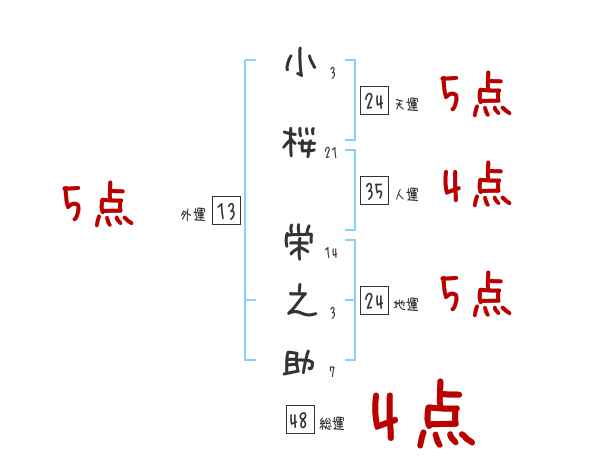 天運![]() | 小桜栄之助さんの天運は24画の5つ星!家庭運が良く順調な人生。金運にも恵まれる。 家系が持つ宿命的な運勢を表します。祖先から受け継いだ苗字ですので自分の力が及びません。家柄を象徴します。 |