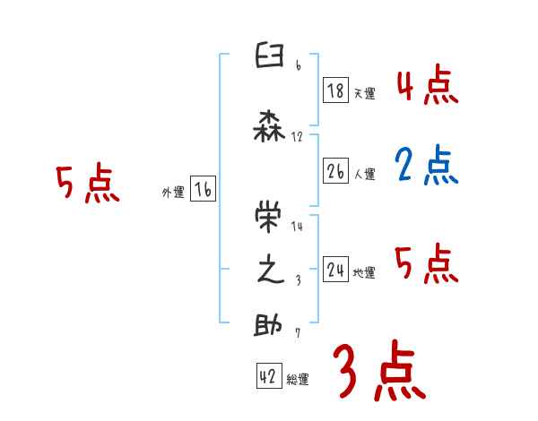 天運![]() | 臼森栄之助さんの天運は18画の4つ星!情熱的で剛気。忍耐力があり信頼される。 家系が持つ宿命的な運勢を表します。祖先から受け継いだ苗字ですので自分の力が及びません。家柄を象徴します。 |