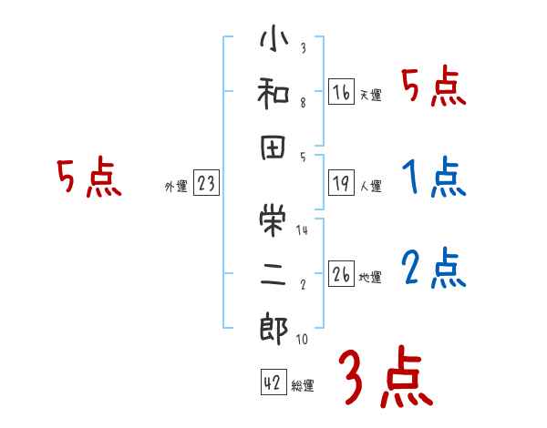 外運![]() | 小和田栄二郎さんの外運は23画の5つ星!想像力に優れ活力がある。一代で成功し名誉を手に入れる。 生活面を象徴する運勢です。外部から受ける影響力を表し、結婚運、家庭運や職場、環境への順応性を表します。 |
