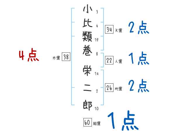 外運![]() | 小比類巻栄二郎さんの外運は38画の4つ星!温厚な性格で技術的な才能を発揮する。職人的な仕事に向いている。 生活面を象徴する運勢です。外部から受ける影響力を表し、結婚運、家庭運や職場、環境への順応性を表します。 |