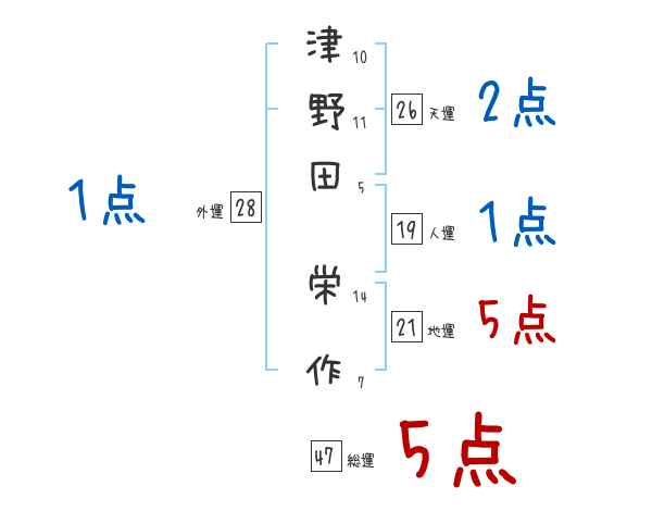 外運![]() | 津野田栄作さんの外運は28画の1つ星!家庭環境に注意。スポーツで活躍できる能力があるかも。 生活面を象徴する運勢です。外部から受ける影響力を表し、結婚運、家庭運や職場、環境への順応性を表します。 |