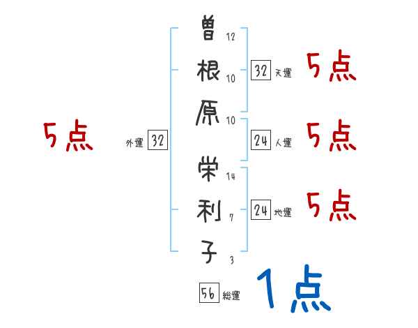 外運![]() | 曽根原栄利子さんの外運は32画の5つ星!柔軟性があり成功する。チャンスが多く金運が良い。 生活面を象徴する運勢です。外部から受ける影響力を表し、結婚運、家庭運や職場、環境への順応性を表します。 |