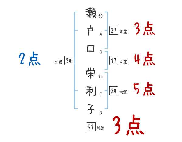 総運![]() | 瀬戸口栄利子さんの総運は51画の3つ星!変化が激しく、危険に注意。堅実な性格。 あなたの人生を表す1番重要な運勢です。生涯を通じて影響する総合運となり、主に50歳以降の晩年期に影響を及ぼします。 |