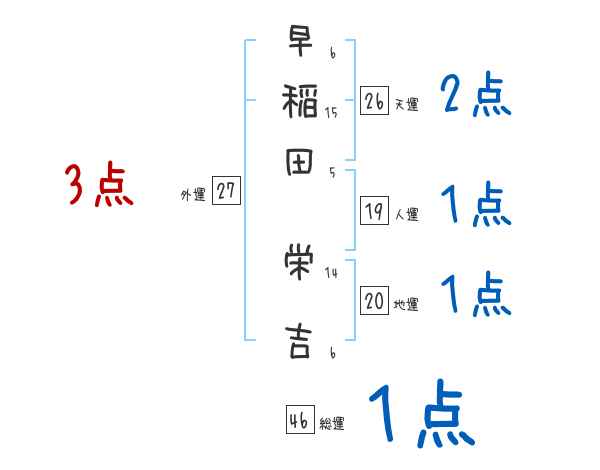 天運![]() | 早稲田栄吉さんの天運は26画の2つ星!波瀾万丈かも。信頼できる人を大事にしましょう。 家系が持つ宿命的な運勢を表します。祖先から受け継いだ苗字ですので自分の力が及びません。家柄を象徴します。 |