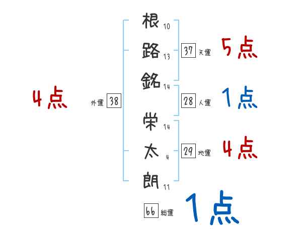 人運![]() | 根路銘栄太朗さんの人運は28画の1つ星!家庭環境に注意。スポーツで活躍できる能力があるかも。 性格や才能などを表す2番目に重要な運勢です。人間関係や協調性、社会的な成功に影響します。主に20歳から50歳ぐらいまでの中年期の運勢を表します。 |