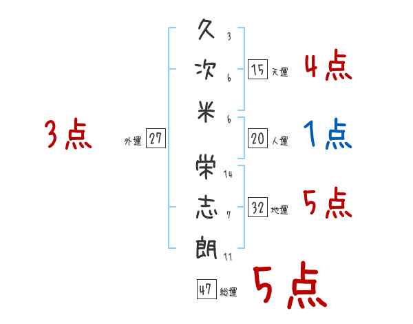 総運![]() | 久次米栄志朗さんの総運は47画の5つ星!実力が開花し発展する円満な人生。財に恵まれる。 あなたの人生を表す1番重要な運勢です。生涯を通じて影響する総合運となり、主に50歳以降の晩年期に影響を及ぼします。 |