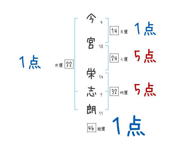 外運![]() | 今宮栄志朗さんの外運は22画の1つ星!努力することが苦手ないっぽう手先が器用。芸術性にも優れる。 生活面を象徴する運勢です。外部から受ける影響力を表し、結婚運、家庭運や職場、環境への順応性を表します。 |
