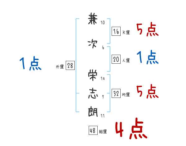 地運![]() | 兼次栄志朗さんの地運は32画の5つ星!柔軟性があり成功する。チャンスが多く金運が良い。 個性を表す基礎的な運勢です。性格形成や対人関係、行動力など家庭環境に影響されます。主に誕生してから20歳くらいまでの若年期の運勢を表します。 |
