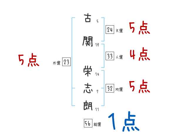 天運![]() | 古関栄志朗さんの天運は24画の5つ星!家庭運が良く順調な人生。金運にも恵まれる。 家系が持つ宿命的な運勢を表します。祖先から受け継いだ苗字ですので自分の力が及びません。家柄を象徴します。 |