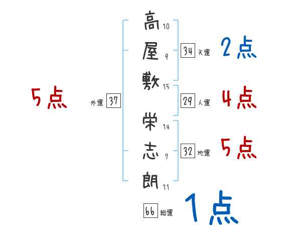 地運![]() | 高屋敷栄志朗さんの地運は32画の5つ星!柔軟性があり成功する。チャンスが多く金運が良い。 個性を表す基礎的な運勢です。性格形成や対人関係、行動力など家庭環境に影響されます。主に誕生してから20歳くらいまでの若年期の運勢を表します。 |