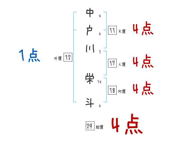 天運![]() | 中戸川栄斗さんの天運は11画の4つ星!着実に富や地位を得る幸運な人生。 家系が持つ宿命的な運勢を表します。祖先から受け継いだ苗字ですので自分の力が及びません。家柄を象徴します。 |