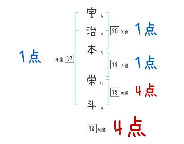 外運![]() | 宇治本栄斗さんの外運は19画の1つ星!優れた才能を持ちますが、協調性が足りないことも。周りの人と協力する事を意識しましょう。 生活面を象徴する運勢です。外部から受ける影響力を表し、結婚運、家庭運や職場、環境への順応性を表します。 |