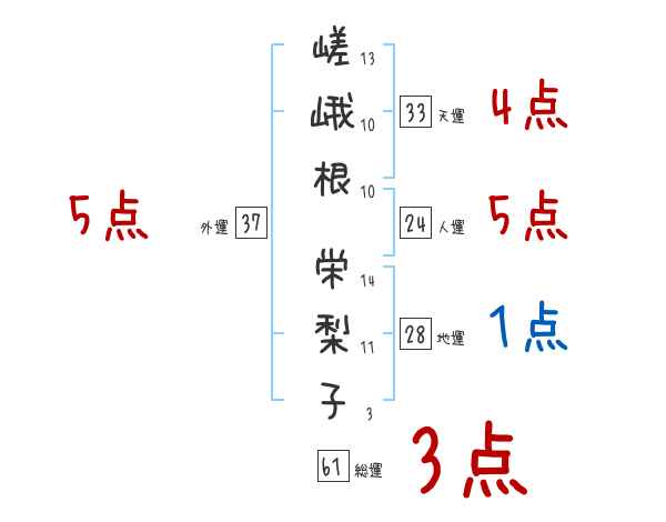 総運![]() | 嵯峨根栄梨子さんの総運は61画の3つ星!強情な性格でうぬぼれタイプ。自ら破滅する。 あなたの人生を表す1番重要な運勢です。生涯を通じて影響する総合運となり、主に50歳以降の晩年期に影響を及ぼします。 |