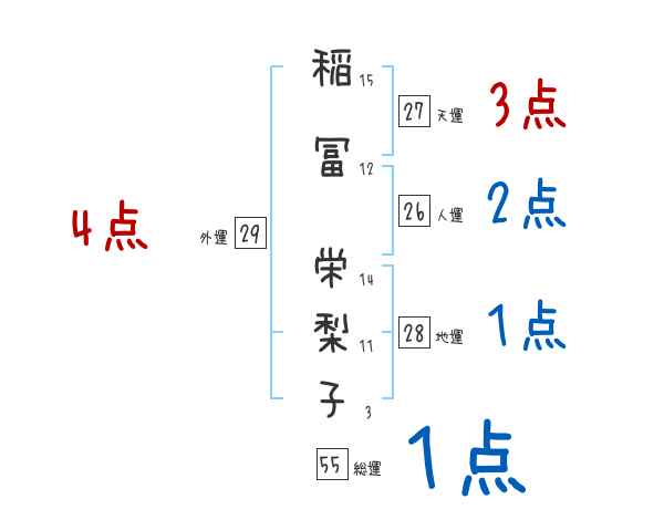 天運![]() | 稲冨栄梨子さんの天運は27画の3つ星!頭脳明晰だが強情で摩擦が多い傾向。孤立に注意。 家系が持つ宿命的な運勢を表します。祖先から受け継いだ苗字ですので自分の力が及びません。家柄を象徴します。 |