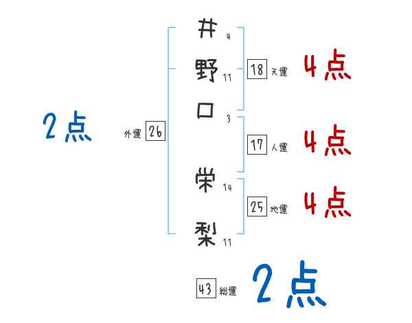 天運![]() | 井野口栄梨さんの天運は18画の4つ星!情熱的で剛気。忍耐力があり信頼される。 家系が持つ宿命的な運勢を表します。祖先から受け継いだ苗字ですので自分の力が及びません。家柄を象徴します。 |