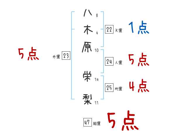 天運![]() | 八木原栄梨さんの天運は22画の1つ星!努力することが苦手ないっぽう手先が器用。芸術性にも優れる。 家系が持つ宿命的な運勢を表します。祖先から受け継いだ苗字ですので自分の力が及びません。家柄を象徴します。 |