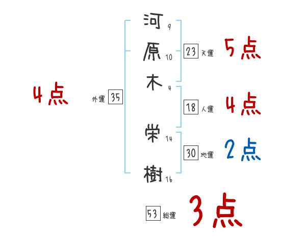 外運![]() | 河原木栄樹さんの外運は35画の4つ星!温厚な性格で感受性が高い。穏和な性格で人望が厚い。 生活面を象徴する運勢です。外部から受ける影響力を表し、結婚運、家庭運や職場、環境への順応性を表します。 |