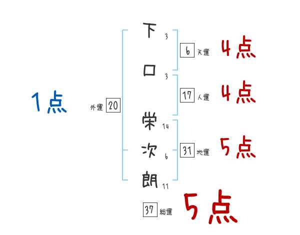 天運![]() | 下口栄次朗さんの天運は6画の4つ星!慎重な努力家で信頼を得る。誠実な精神で向上心に優れる。 家系が持つ宿命的な運勢を表します。祖先から受け継いだ苗字ですので自分の力が及びません。家柄を象徴します。 |