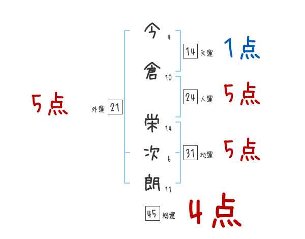 総運![]() | 今倉栄次朗さんの総運は45画の4つ星!もくもくと物事を進め達成する。地味な努力家。 あなたの人生を表す1番重要な運勢です。生涯を通じて影響する総合運となり、主に50歳以降の晩年期に影響を及ぼします。 |