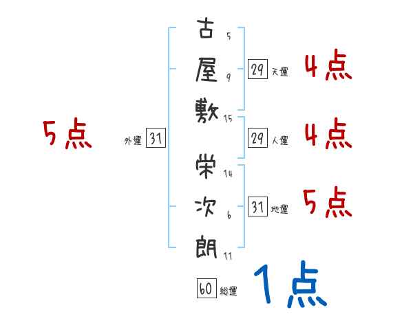 地運![]() | 古屋敷栄次朗さんの地運は31画の5つ星!社交性があり判断力に優れる。順風満帆な人生で円満な生活。 個性を表す基礎的な運勢です。性格形成や対人関係、行動力など家庭環境に影響されます。主に誕生してから20歳くらいまでの若年期の運勢を表します。 |