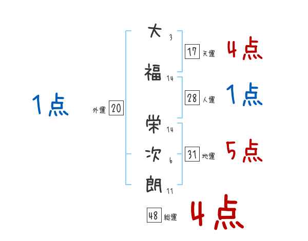 人運![]() | 大福栄次朗さんの人運は28画の1つ星!家庭環境に注意。スポーツで活躍できる能力があるかも。 性格や才能などを表す2番目に重要な運勢です。人間関係や協調性、社会的な成功に影響します。主に20歳から50歳ぐらいまでの中年期の運勢を表します。 |