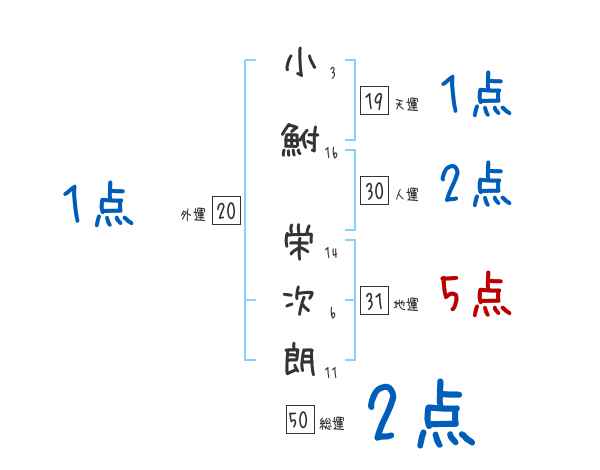 総運![]() | 小鮒栄次朗さんの総運は50画の2つ星!浮き沈みが激しく不安定。しりすぼみに衰退しやすいので注意しましょう。 あなたの人生を表す1番重要な運勢です。生涯を通じて影響する総合運となり、主に50歳以降の晩年期に影響を及ぼします。 |