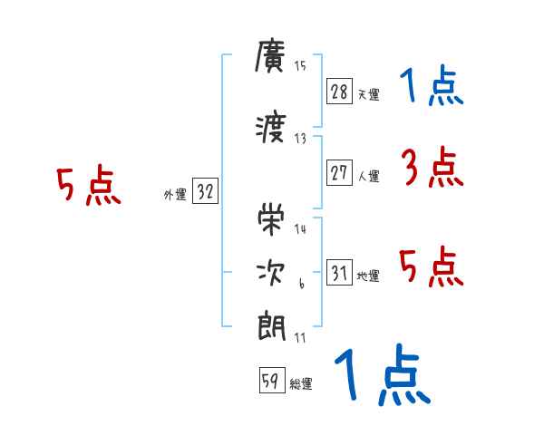 外運![]() | 廣渡栄次朗さんの外運は32画の5つ星!柔軟性があり成功する。チャンスが多く金運が良い。 生活面を象徴する運勢です。外部から受ける影響力を表し、結婚運、家庭運や職場、環境への順応性を表します。 |