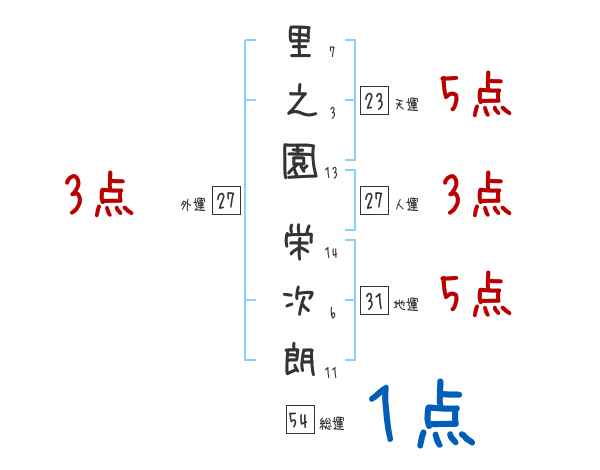総運![]() | 里之園栄次朗さんの総運は54画の1つ星!トラブルが多いかも。周りをよく見て協調して過ごしましょう。 あなたの人生を表す1番重要な運勢です。生涯を通じて影響する総合運となり、主に50歳以降の晩年期に影響を及ぼします。 |