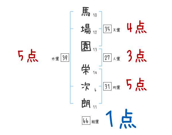 外運![]() | 馬場園栄次朗さんの外運は39画の5つ星!社交性に優れ人望が厚い。人の上に立ち成功する。 生活面を象徴する運勢です。外部から受ける影響力を表し、結婚運、家庭運や職場、環境への順応性を表します。 |