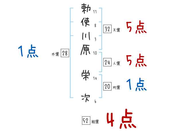 外運![]() | 勅使川原栄次さんの外運は28画の1つ星!家庭環境に注意。スポーツで活躍できる能力があるかも。 生活面を象徴する運勢です。外部から受ける影響力を表し、結婚運、家庭運や職場、環境への順応性を表します。 |
