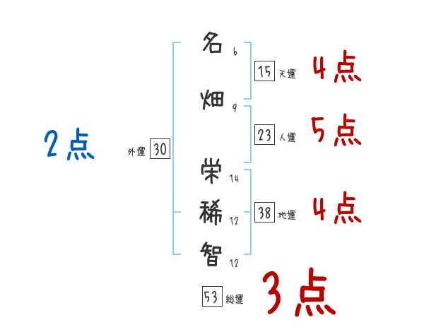 総運![]() | 名畑栄稀智さんの総運は53画の3つ星!やや見栄っ張りで虚栄心がある。散財に注意。 あなたの人生を表す1番重要な運勢です。生涯を通じて影響する総合運となり、主に50歳以降の晩年期に影響を及ぼします。 |