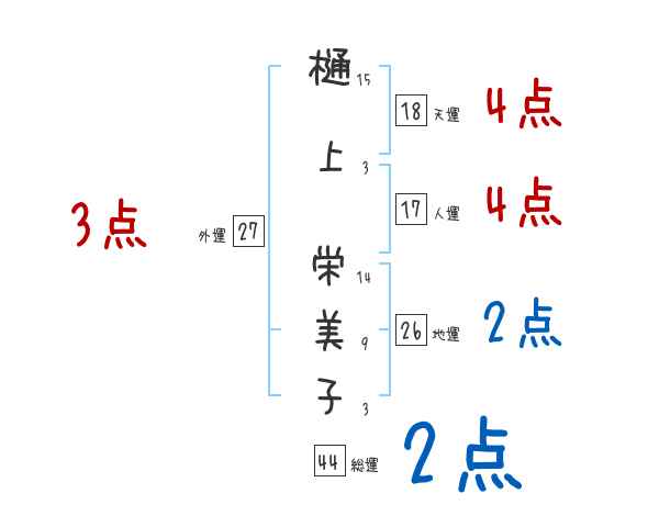 総運![]() | 樋上栄美子さんの総運は44画の2つ星!誠実で慎重な性格。物事を考えすぎないように注意しましょう。 あなたの人生を表す1番重要な運勢です。生涯を通じて影響する総合運となり、主に50歳以降の晩年期に影響を及ぼします。 |