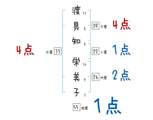 天運![]() | 渡具知栄美子さんの天運は29画の4つ星!完全主義で才能がある。厳格な心の持ち主。 家系が持つ宿命的な運勢を表します。祖先から受け継いだ苗字ですので自分の力が及びません。家柄を象徴します。 |