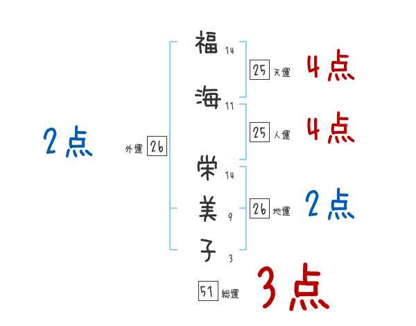 外運![]() | 福海栄美子さんの外運は26画の2つ星!波瀾万丈かも。信頼できる人を大事にしましょう。 生活面を象徴する運勢です。外部から受ける影響力を表し、結婚運、家庭運や職場、環境への順応性を表します。 |