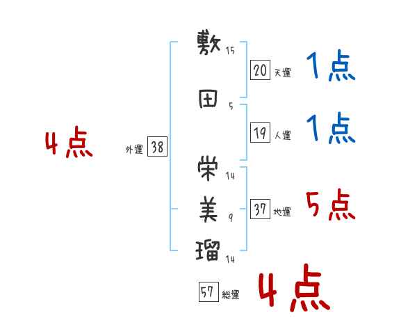 外運![]() | 敷田栄美瑠さんの外運は38画の4つ星!温厚な性格で技術的な才能を発揮する。職人的な仕事に向いている。 生活面を象徴する運勢です。外部から受ける影響力を表し、結婚運、家庭運や職場、環境への順応性を表します。 |