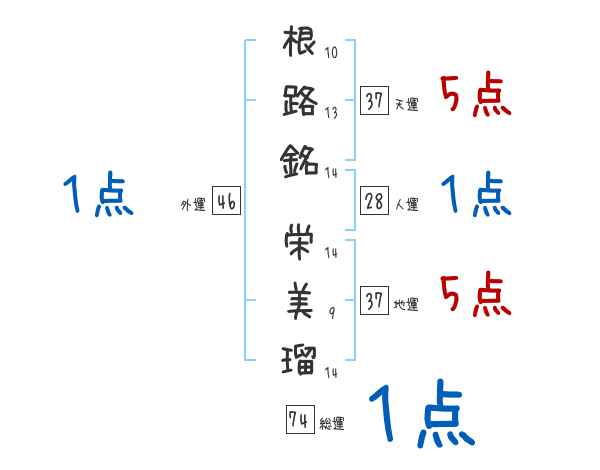 地運![]() | 根路銘栄美瑠さんの地運は37画の5つ星!努力家で順応性に優れる。現実的な考え方ができ忠実に物事をこなす。 個性を表す基礎的な運勢です。性格形成や対人関係、行動力など家庭環境に影響されます。主に誕生してから20歳くらいまでの若年期の運勢を表します。 |