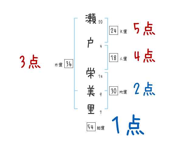 天運![]() | 瀬戸栄美里さんの天運は24画の5つ星!家庭運が良く順調な人生。金運にも恵まれる。 家系が持つ宿命的な運勢を表します。祖先から受け継いだ苗字ですので自分の力が及びません。家柄を象徴します。 |