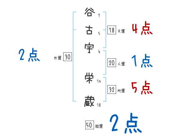 天運![]() | 谷古宇栄蔵さんの天運は18画の4つ星!情熱的で剛気。忍耐力があり信頼される。 家系が持つ宿命的な運勢を表します。祖先から受け継いだ苗字ですので自分の力が及びません。家柄を象徴します。 |