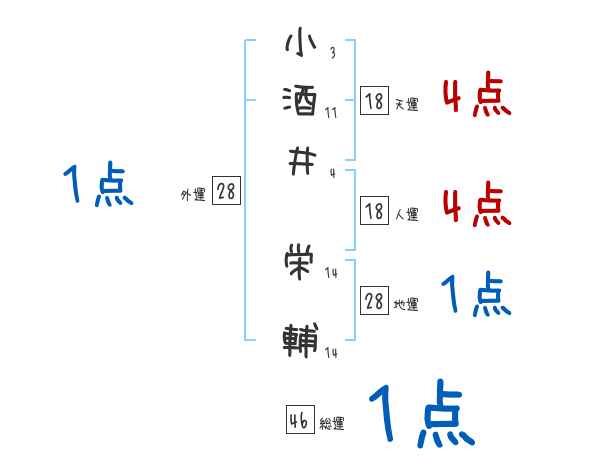天運![]() | 小酒井栄輔さんの天運は18画の4つ星!情熱的で剛気。忍耐力があり信頼される。 家系が持つ宿命的な運勢を表します。祖先から受け継いだ苗字ですので自分の力が及びません。家柄を象徴します。 |
